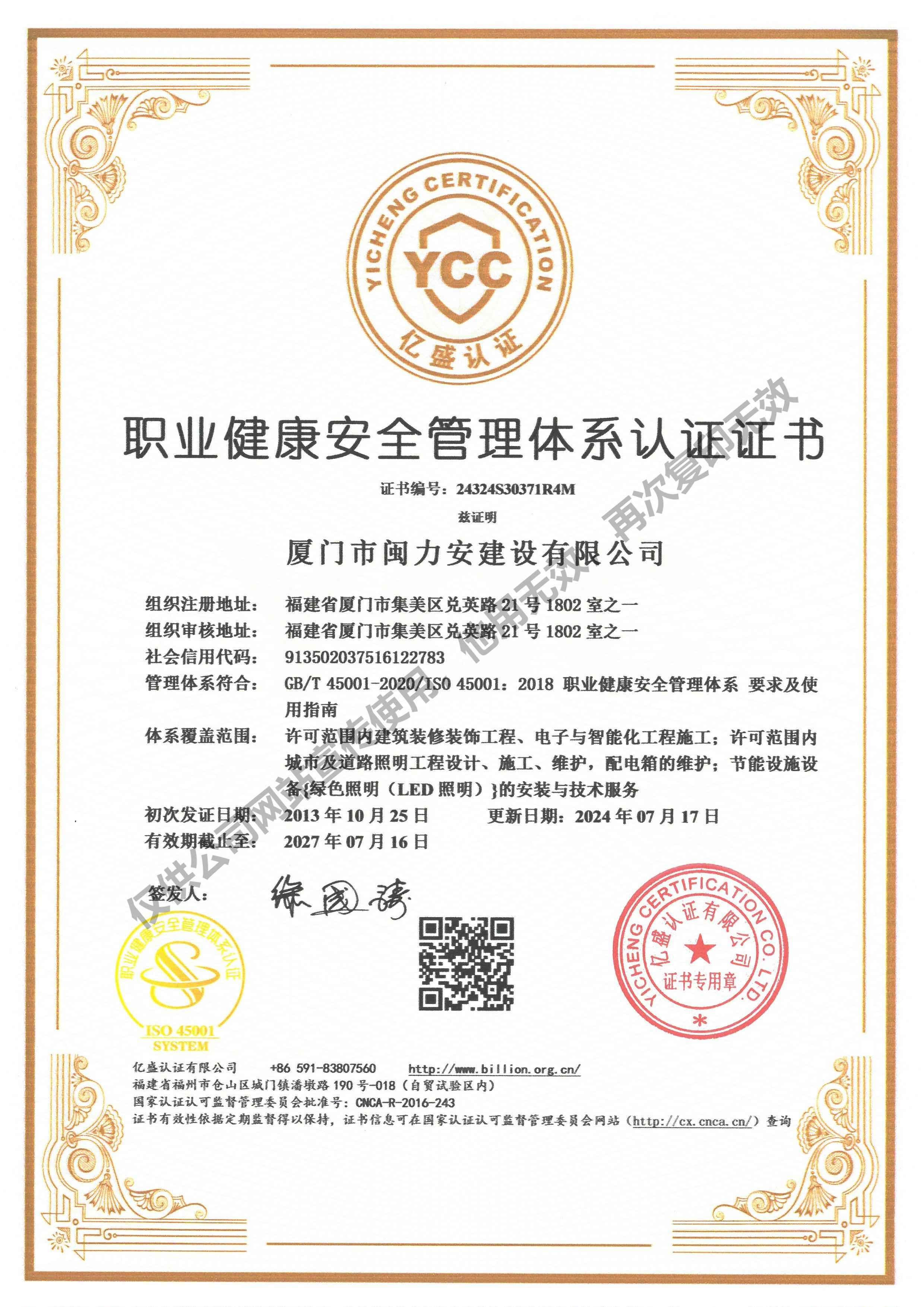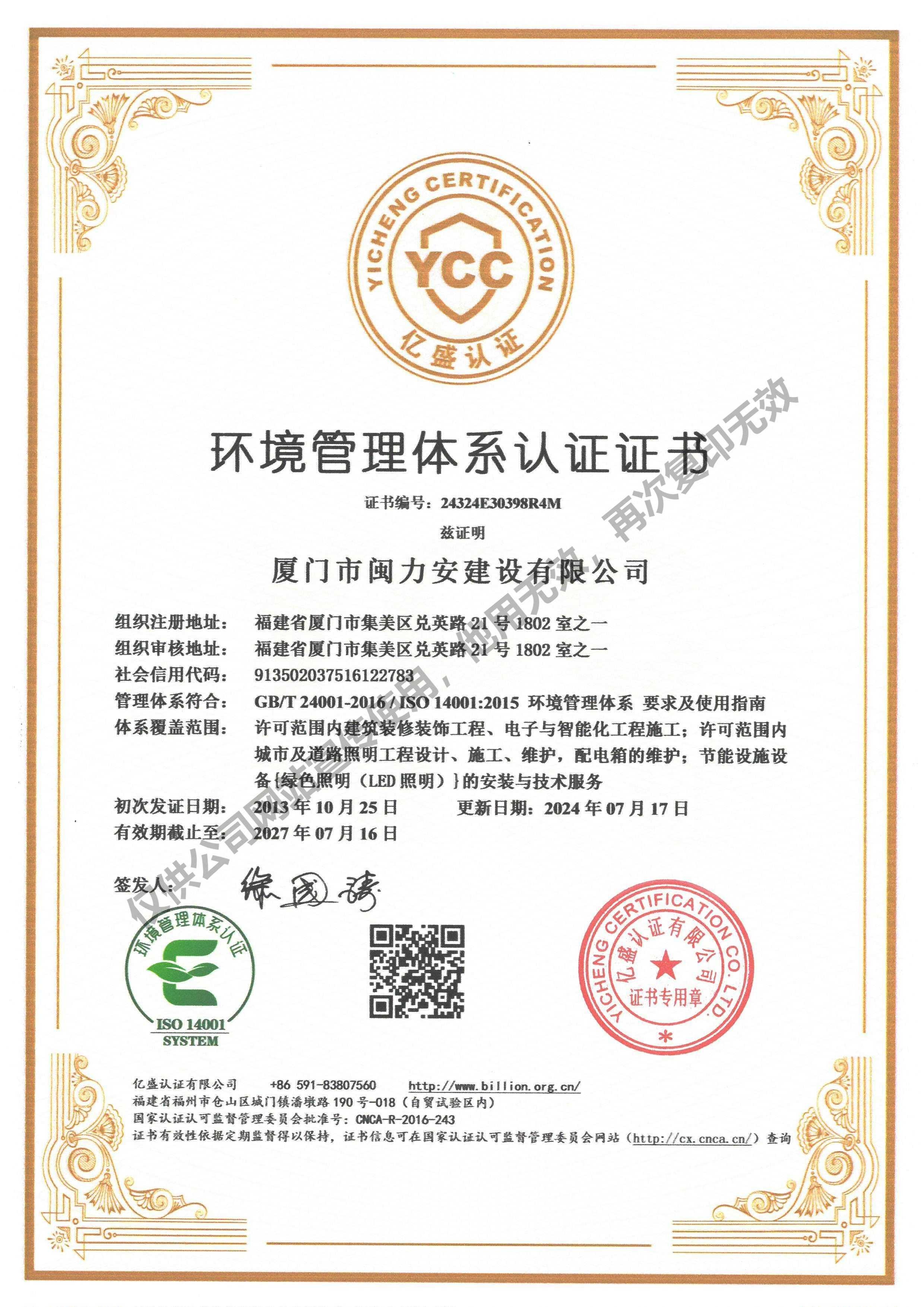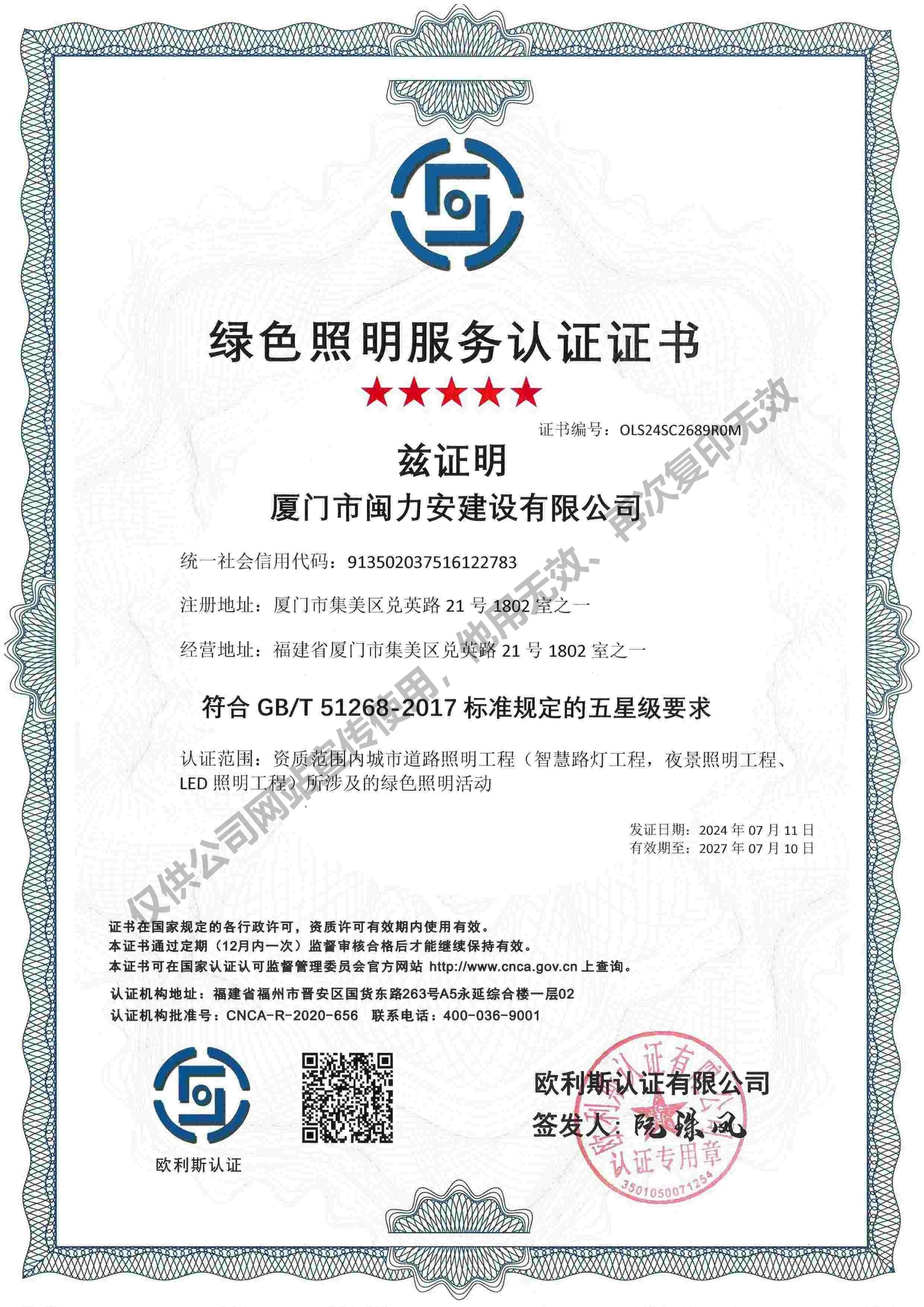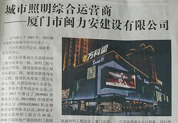 廈門市閩力安建設(shè)有限公司成立于2003年,公司取得市政公用工程施工總承包貳級、建筑裝修裝飾工程專業(yè)承包壹級、城市及道路照明工程專業(yè)承包壹級、電子與智能化工程專業(yè)承包貳級、消防設(shè)施工程專業(yè)承包貳級、電力工程施工總承包叁級、建筑機(jī)電安裝工程專業(yè)承包叁級、輸變電工程專業(yè)承包叁級、環(huán)保工程專業(yè)承包叁級、照明工程設(shè)計(jì)專項(xiàng)甲級、建筑裝飾工程設(shè)計(jì)乙級、施工勞務(wù)等資質(zhì)的綜合型企業(yè),公司于2013年通過了ISO9001質(zhì)量體系認(rèn)證,ISO14001環(huán)境管理體系認(rèn)證,OHSAS18001職業(yè)健康安全管理體系認(rèn)證。
